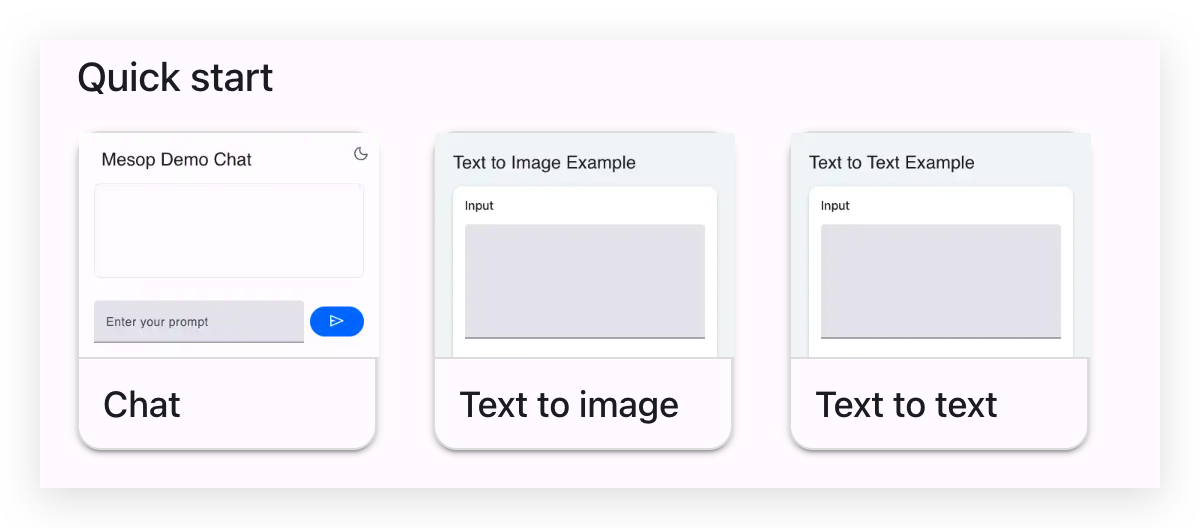 One of the biggest advantages of Mesop is its highly abstract component design, which significantly reduces the time and difficulty for the developers to create regular apps to test LLM. Here are the current three high-level components “Chat”, “Text to image” , and “Text to text”, and I believe they will release more in this category.