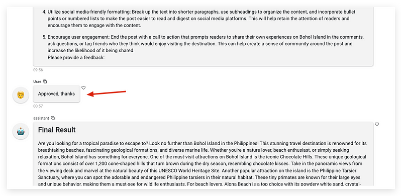 The collaborative nature of the internal thought-decision-action process within a multi-agent workflow doesn’t align well with the store-restore paradigm especially when human interaction is involved. In CrewAI, when an agent requests human input, it halts the entire workflow and utilizes the standard input function input() to await user input on the terminal. If we were to replace the standard input with Streamlit’s chat input widget in our design, any user input would trigger a workflow restart, causing the generated thoughts and actions to vanish.