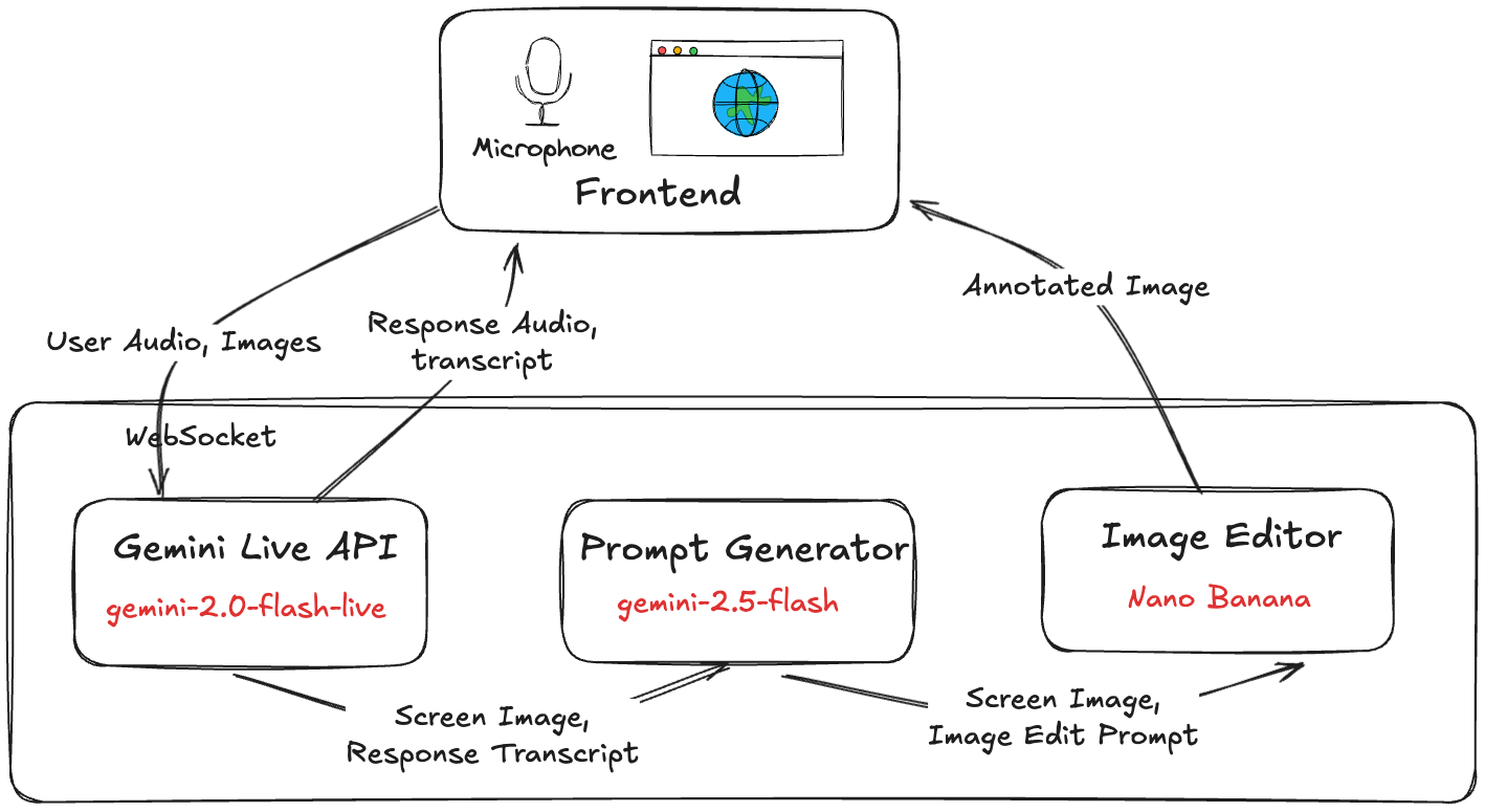 This diagram shows the flow of information in our system. It all starts with the user's browser, which streams their voice and screen capture to our backend server over a WebSocket. The backend forwards this live data to the Gemini Live model. Gemini Live processes the input and generates a spoken audio response, which is streamed back to the user. It also provides a live text transcript of both the user's speech and its own response.